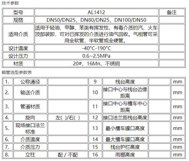顶部卸车鹤管AL1403系列鹤管也是石化装车行业常用的结构形式,特别适用于立柱要求短,内臂要求离栈台面低的情况。适用于汽、煤、柴油、液态化工介质的汽、火车顶部卸车,可选配潜油泵(液动潜油泵、电动潜油泵)。另外它也是典型的一种卸车结构鹤管,主要由立柱,内臂,外臂,真空断流器,垂管,弹簧缸平衡系统,内臂锁紧等组成。可根据不同的介质需求和参数规格进行定制生产,如果您有疑问,请联系在线客服进行详细咨询。